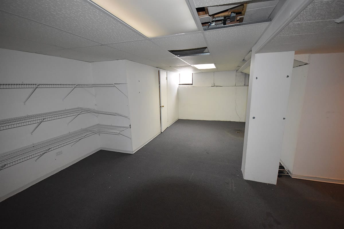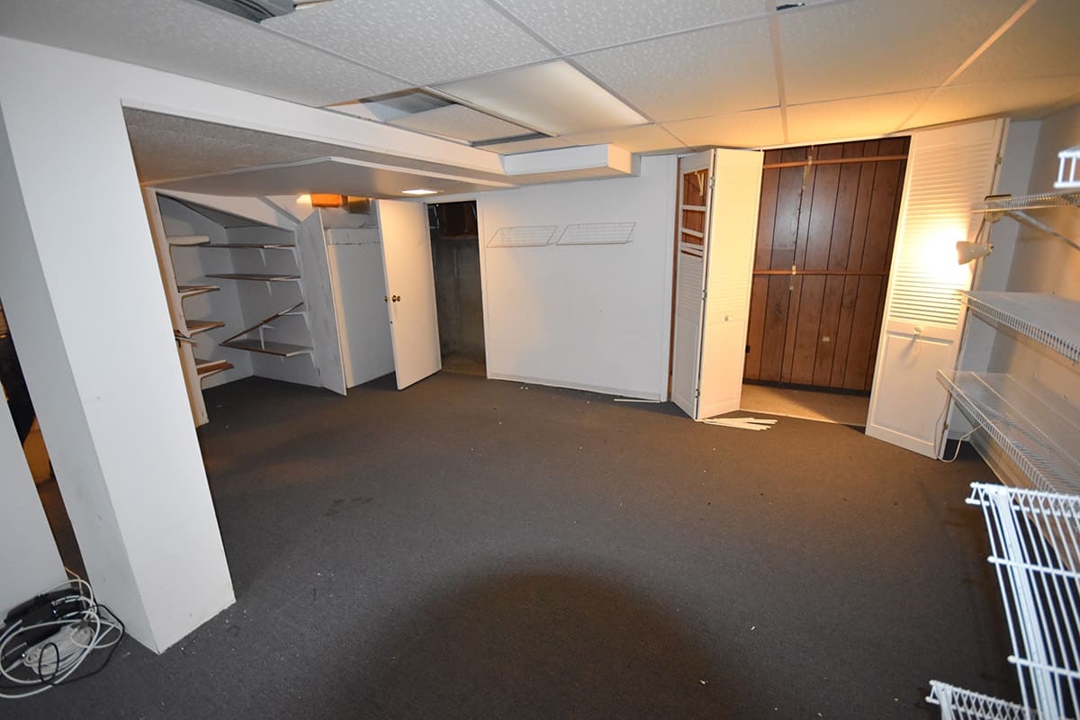 The existing basement had a utilitarian design with exposed utilities, worn carpeting, and outdated shelving units. The space lacked proper lighting, creating a dark and uninviting atmosphere.