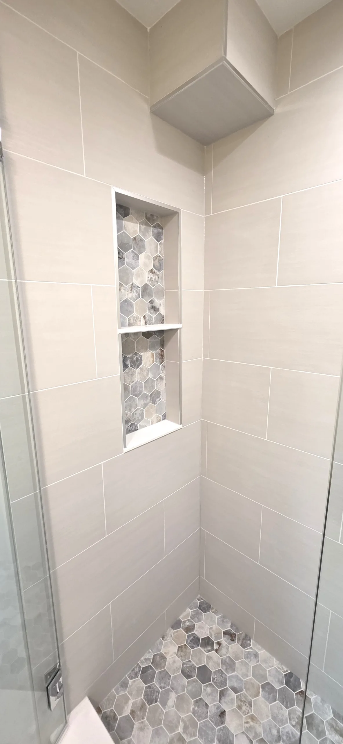 Custom Walk-in Shower: Featuring a frameless glass enclosure, a built-in shower seat, and a contrasting black-framed recessed wall niche for storage.