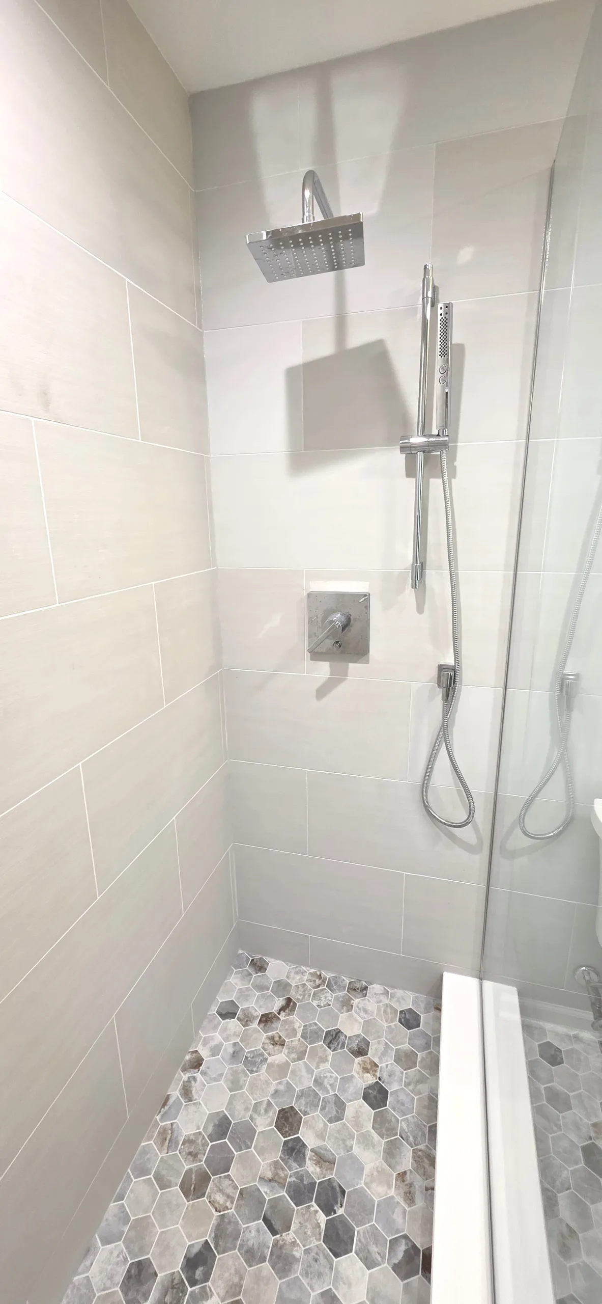 Updated Tiling: Large-format marble-look porcelain wall tiles combined with geometric patterned floor tiles.