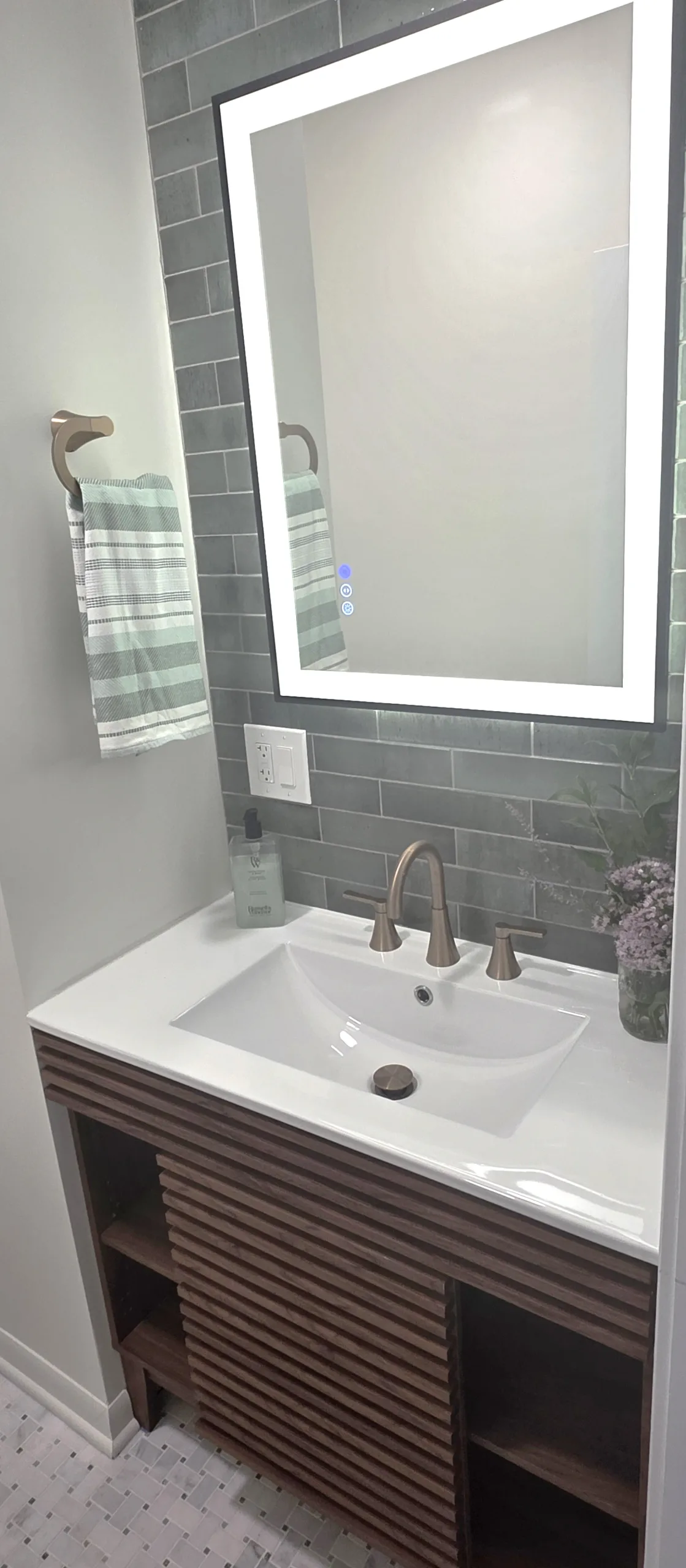 Designer Bathroom Vanity: A unique wood-slat floating vanity that provides both storage and a natural aesthetic.