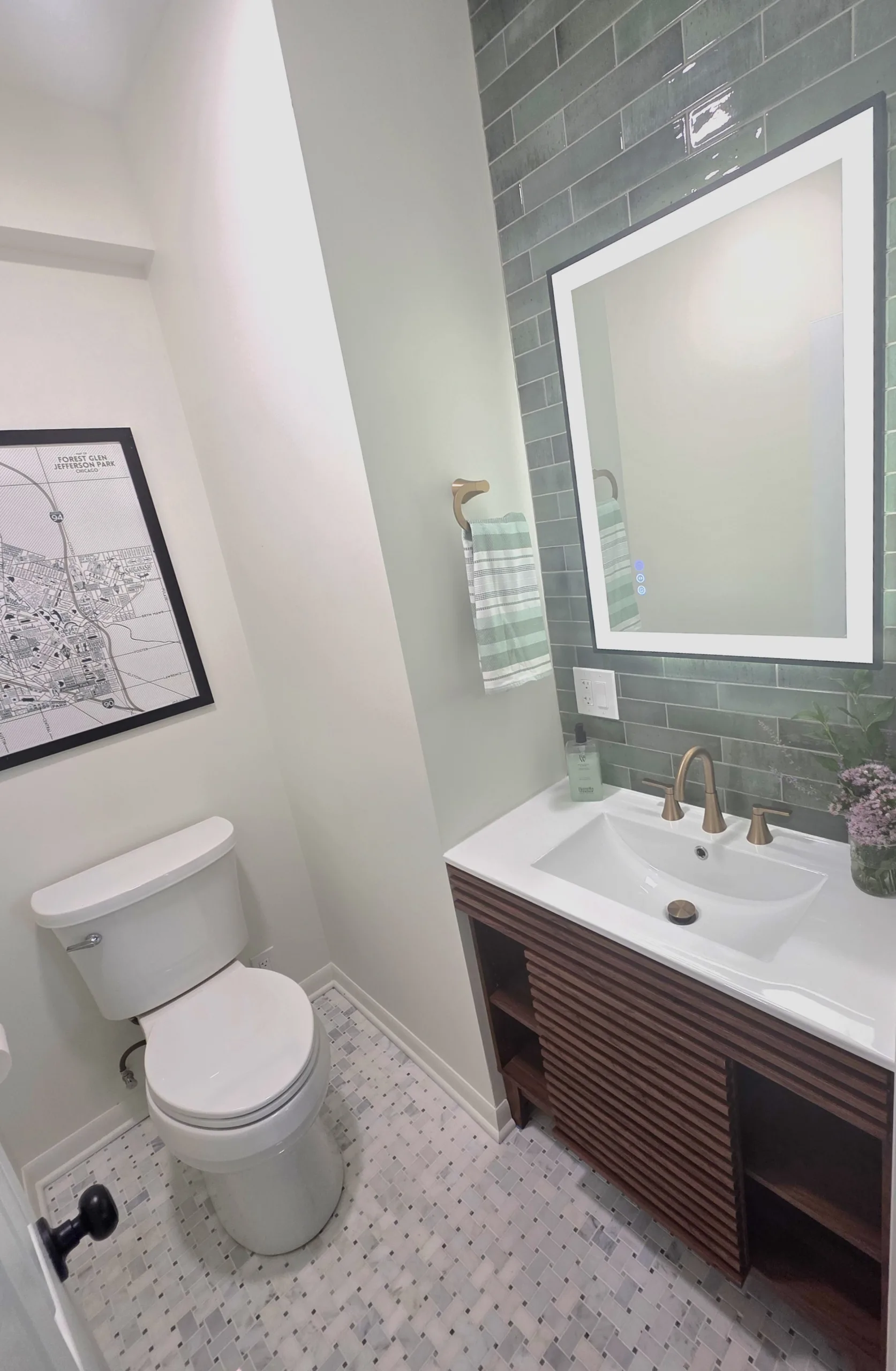 Maya Construction Group, led by owners Udi Yeger and Ofer Gliksman, completed a full renovation to bring both rooms up to modern standards. We introduced a bold deep-green color palette for the kitchen and a warm, natural wood theme for the bathroom. By reconfiguring the kitchen with a central island and installing a functional vanity in the bath, we improved both the appearance and the day-to-day usability of the home.