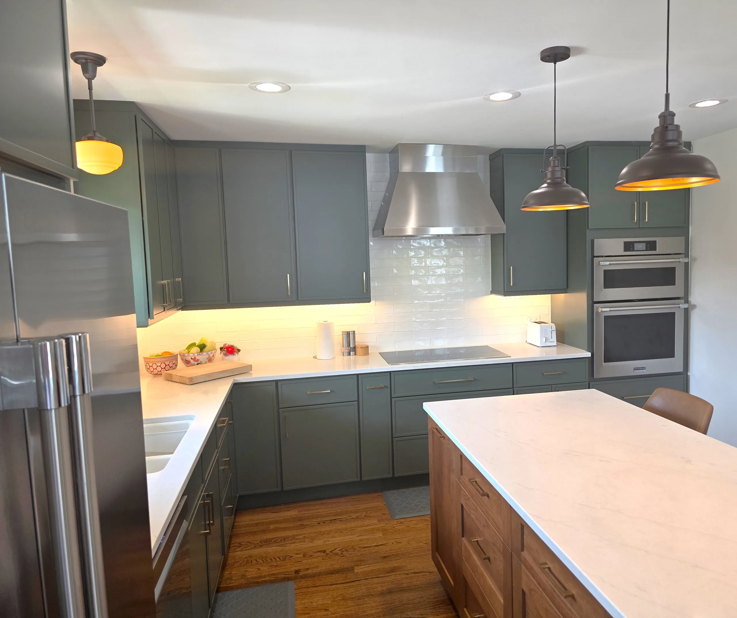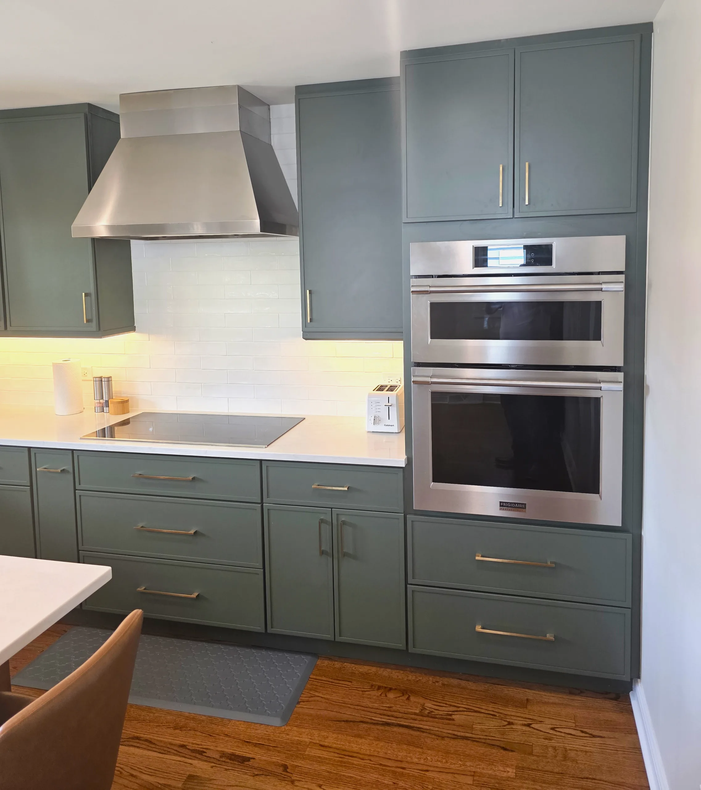 Custom Kitchen Cabinetry: Shaker-style units in a deep green finish paired with modern gold-toned handles.