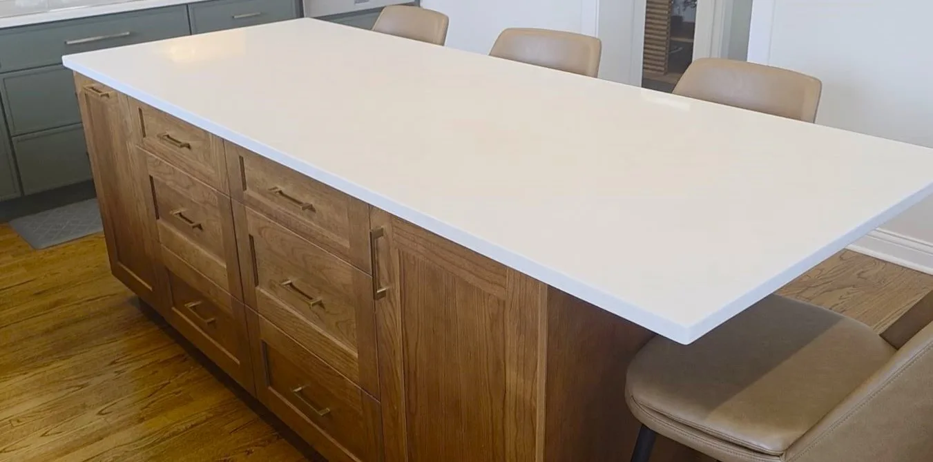 Quartz Countertops: Durable white surfaces with light marbling installed on the main counters and the custom island.