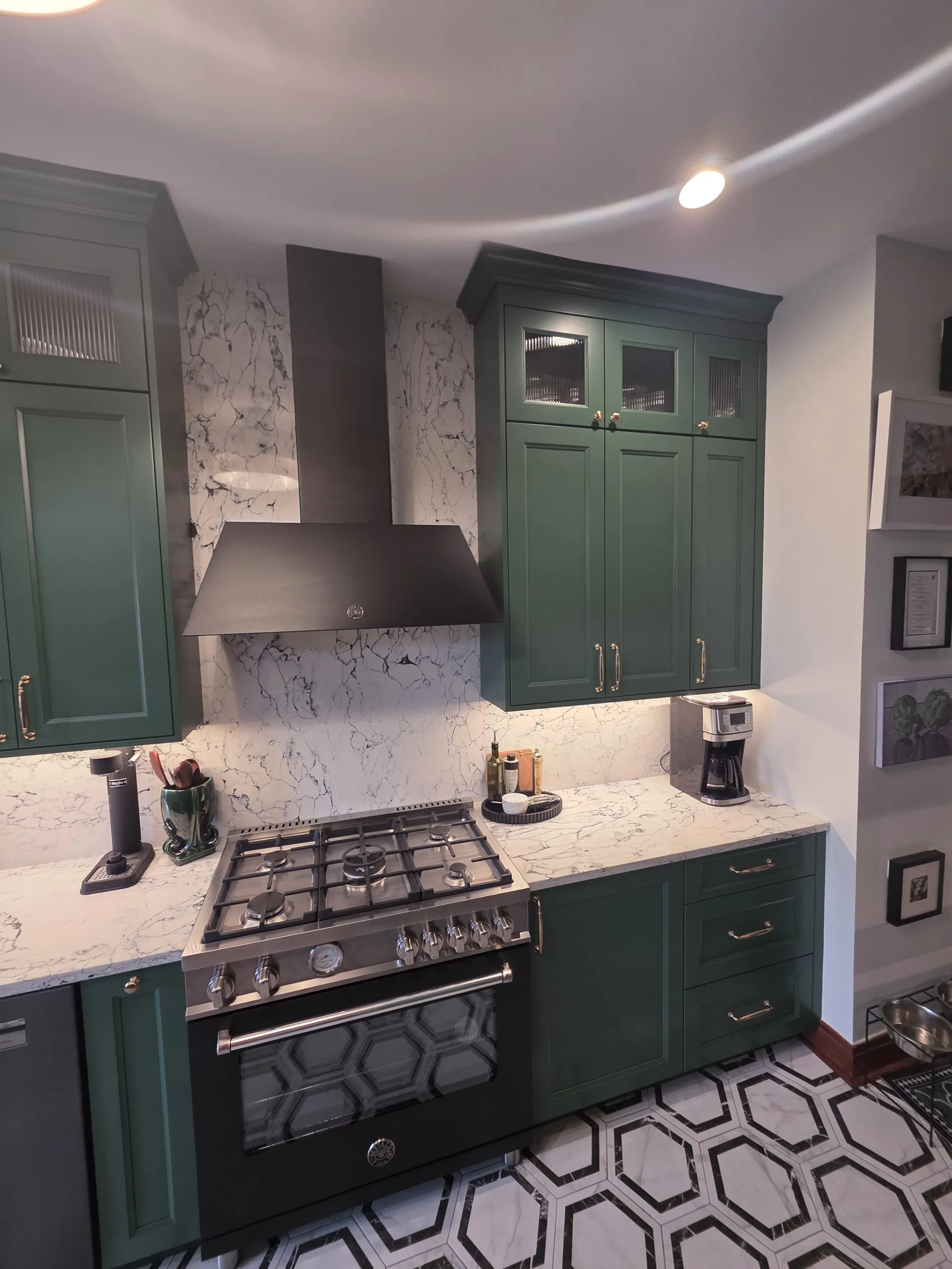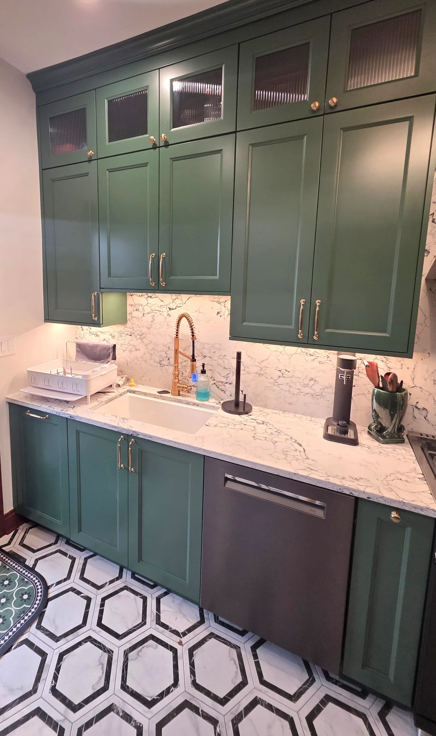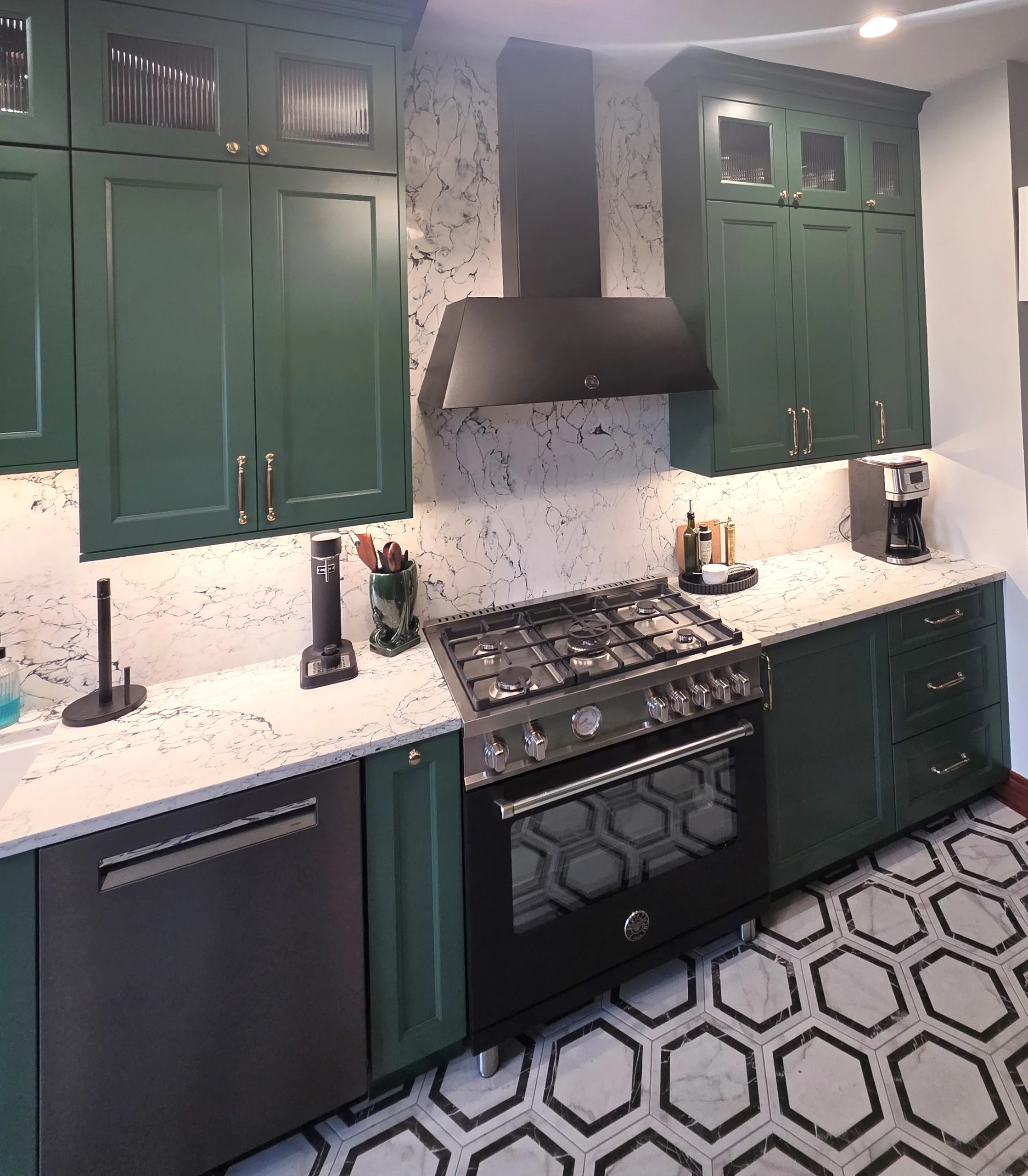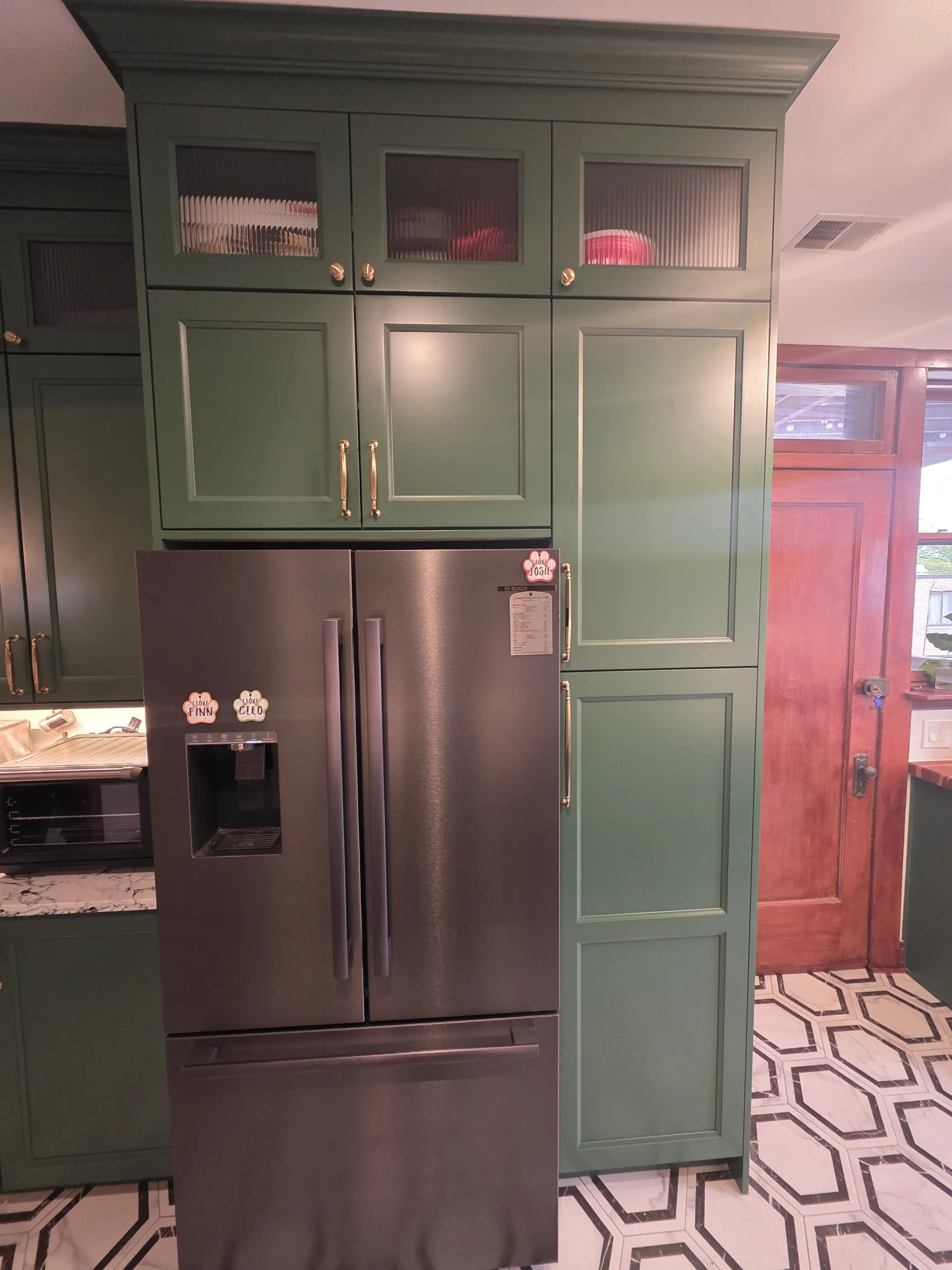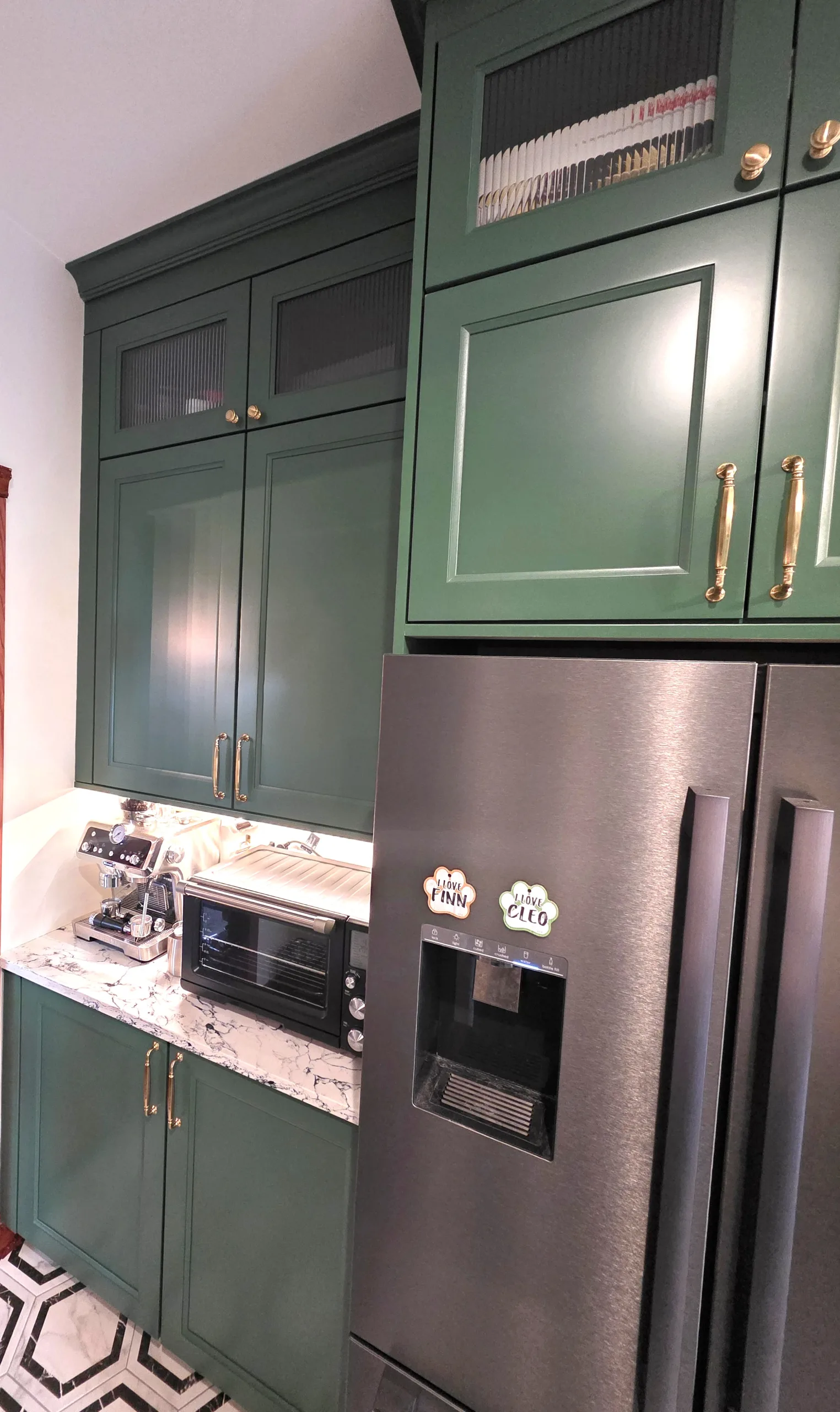 Cabinetry Upgrade: Custom-built shaker-style cabinets in a deep forest green finish with soft-close hinges.