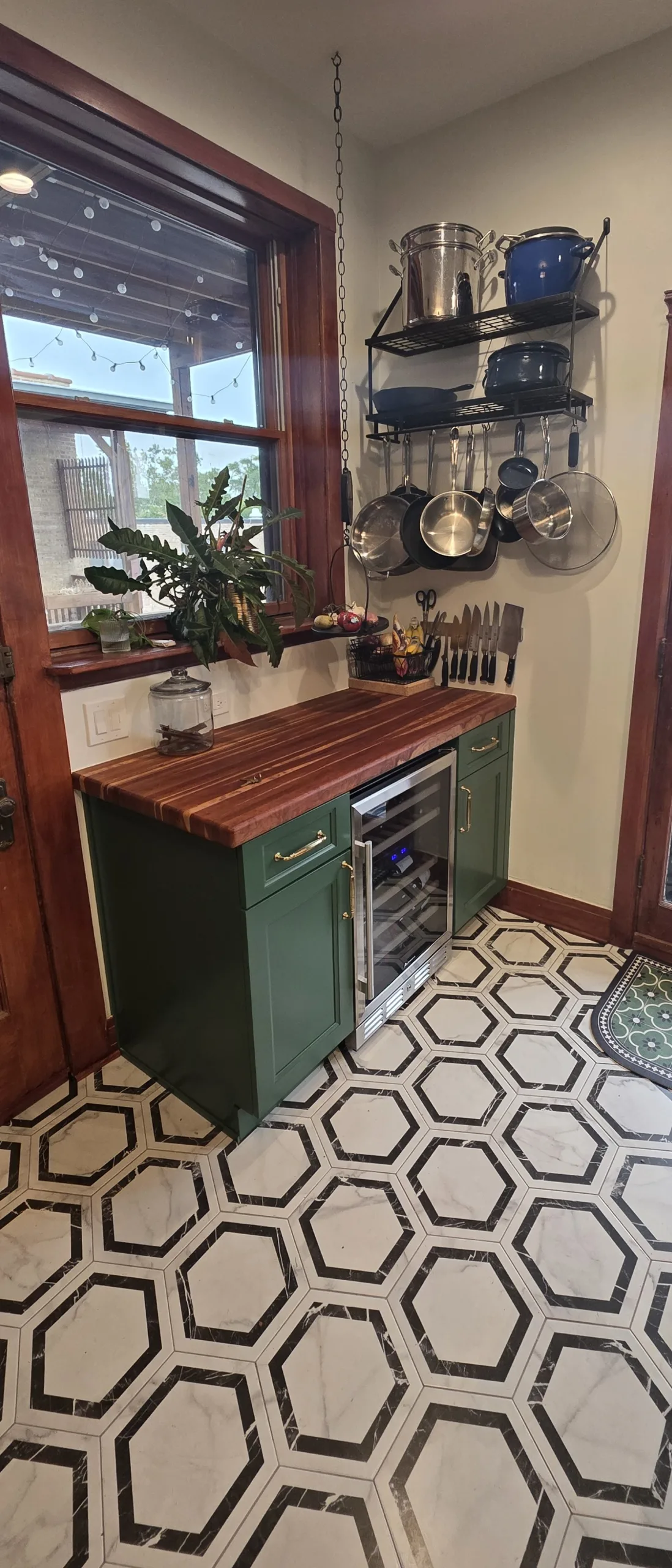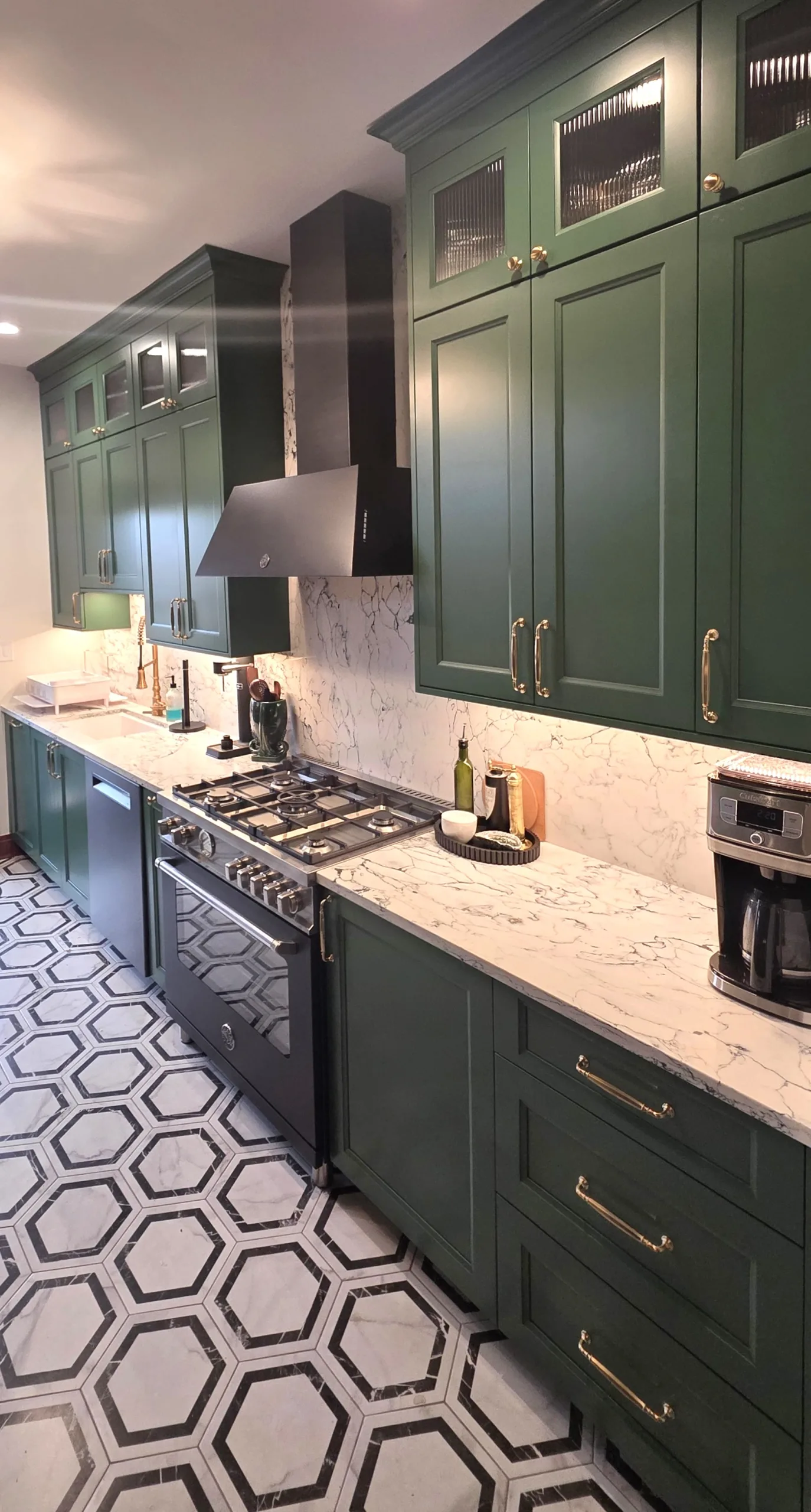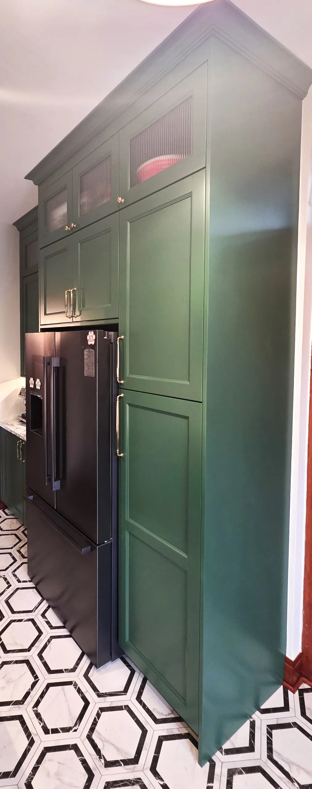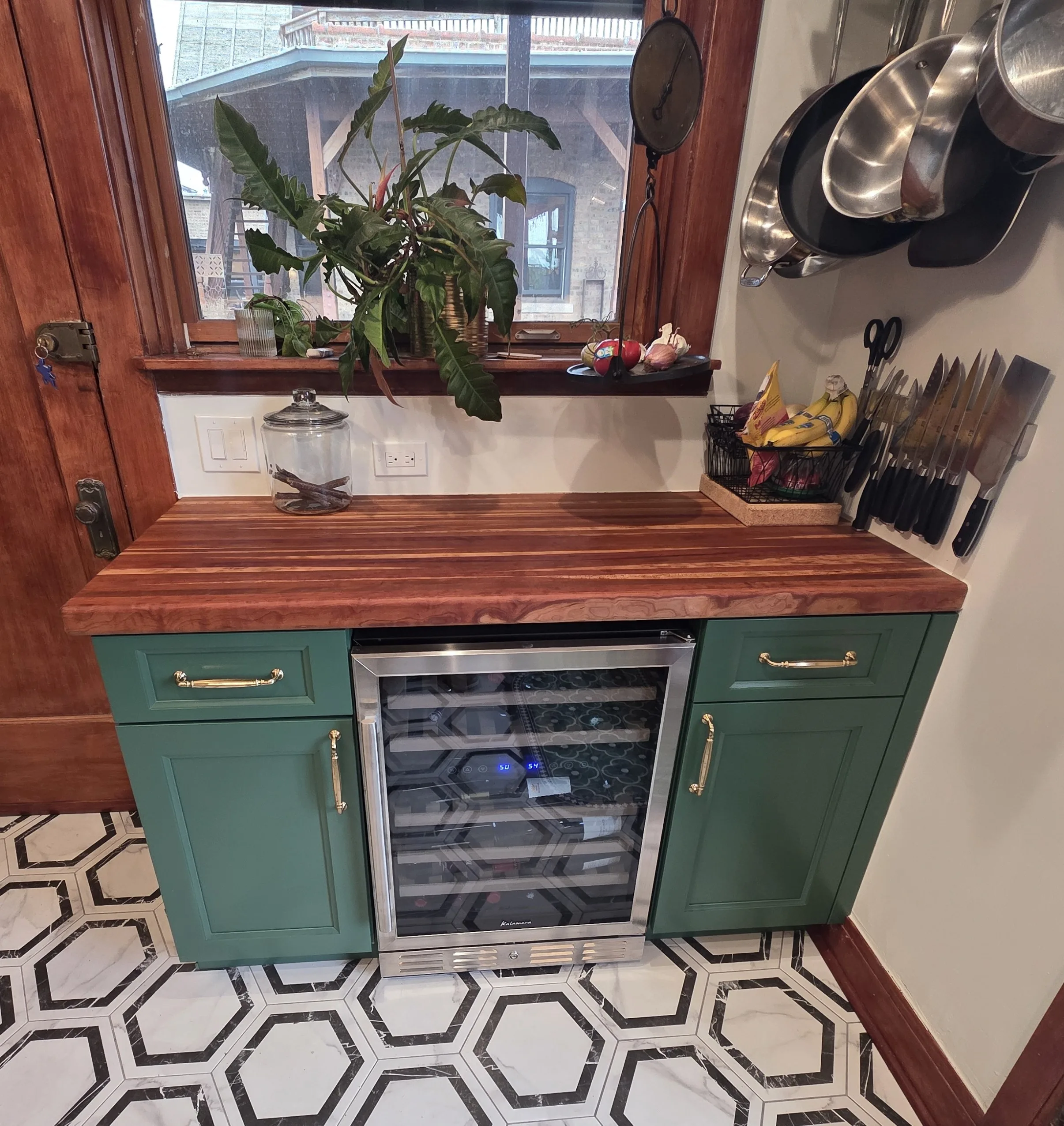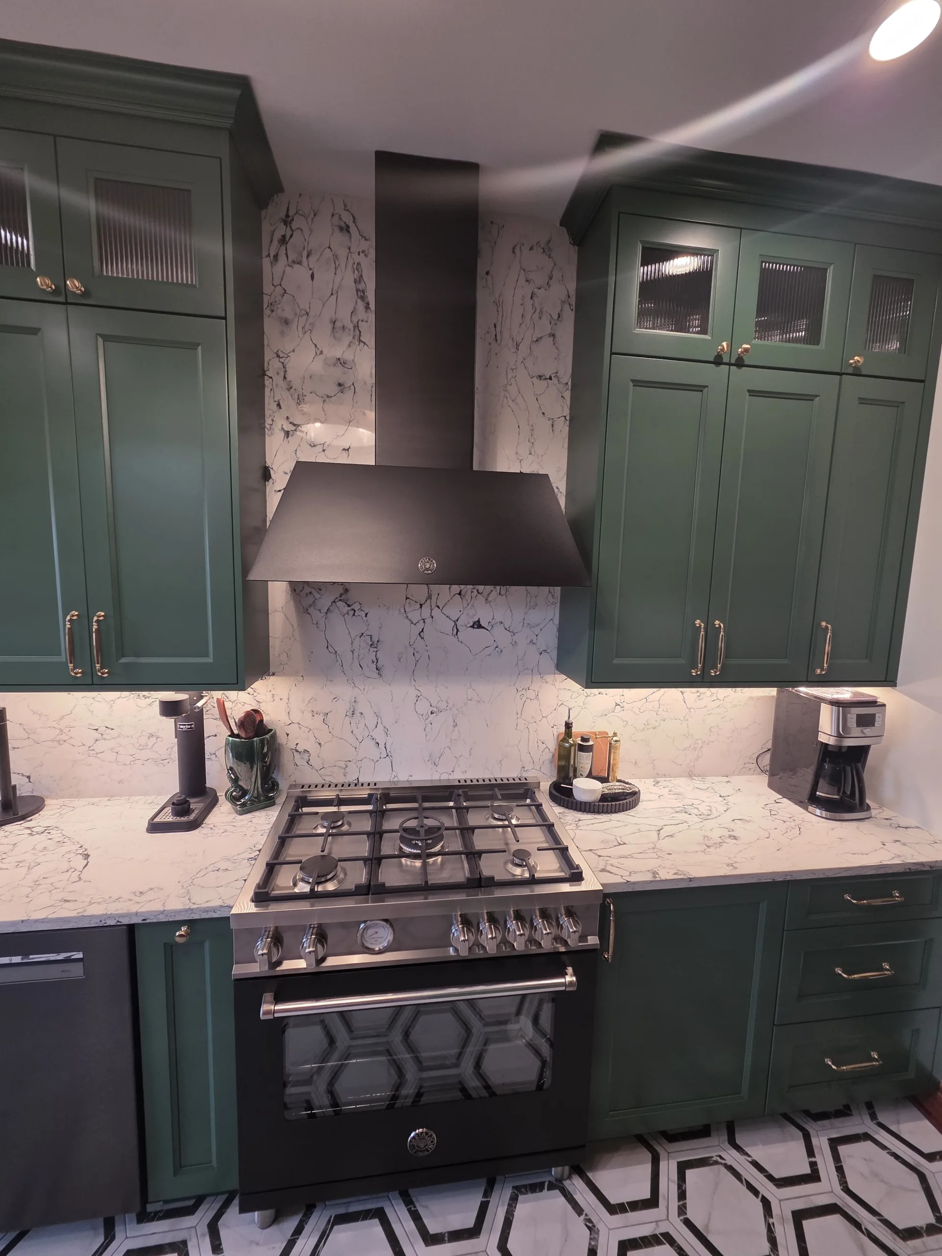 Cabinetry Upgrade: Custom-built shaker-style cabinets in a deep forest green finish with soft-close hinges.