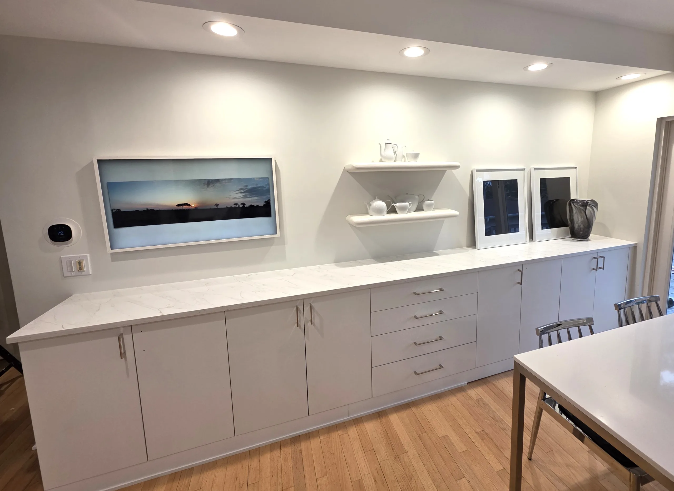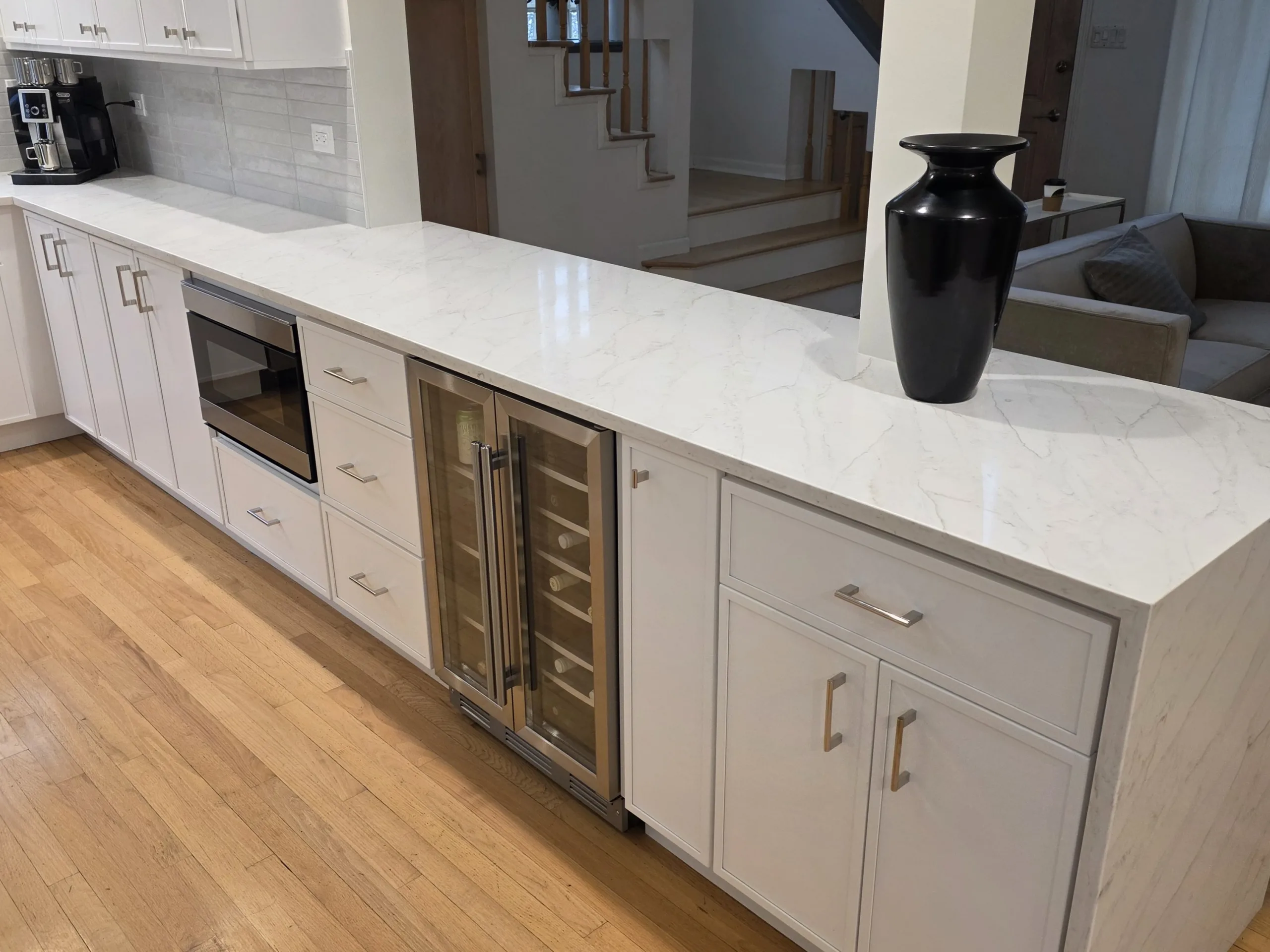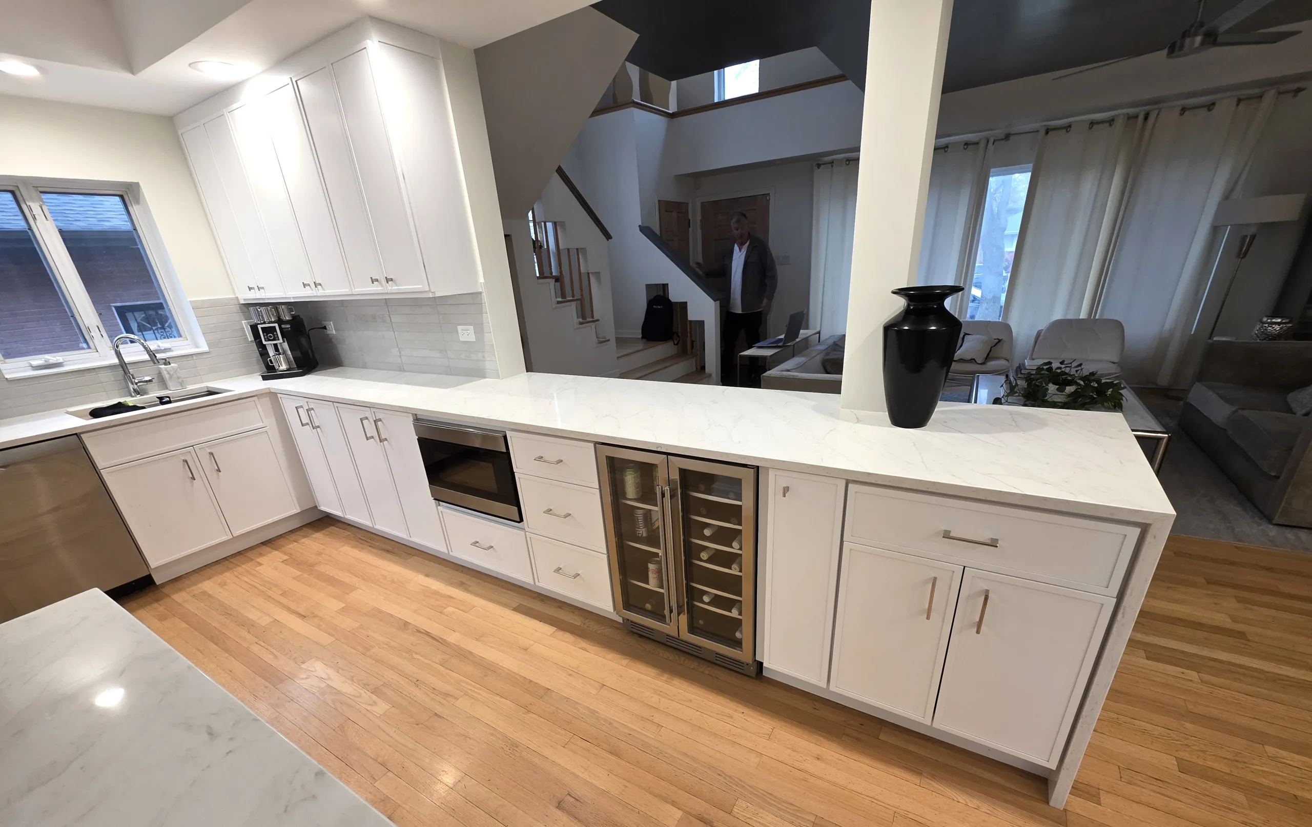 Maya Construction Group, led by owners Udi Yeger and Ofer Gliksman, designed a layout that prioritizes flow. We installed custom floor-to-ceiling cabinetry to provide maximum storage without cluttering the visual space. A long peninsula with a waterfall quartz edge was added to create a natural transition between the kitchen and the living room, offering a casual dining spot and a dedicated area for a built-in beverage center.