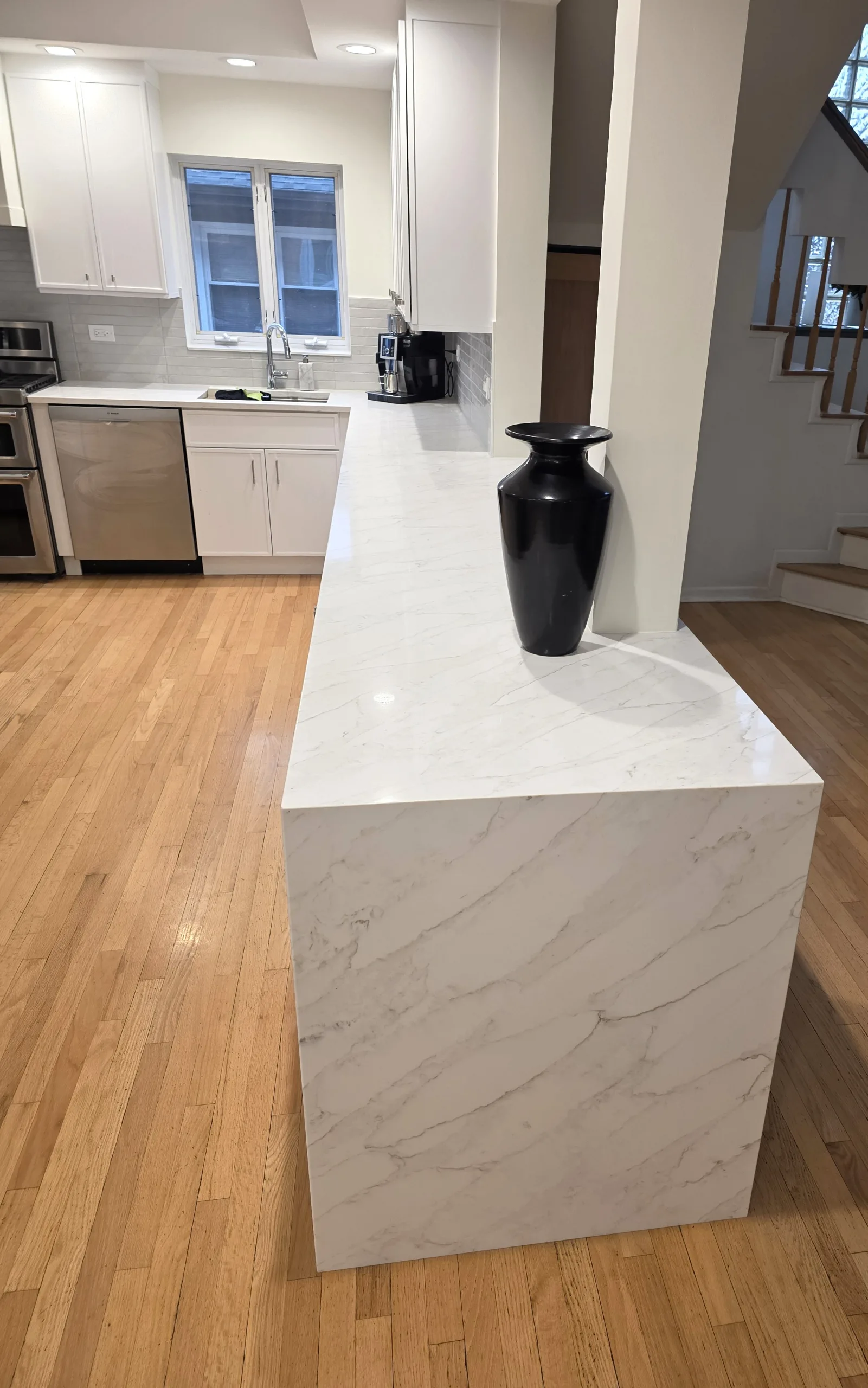 Premium Stone Surfaces: White quartz countertops featuring subtle gray veining, finished with a contemporary waterfall edge on the peninsula.